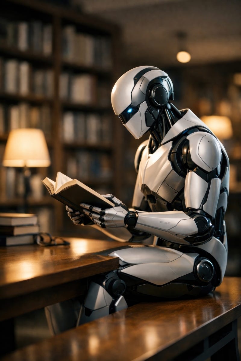 Futuristic Robot Reading a Book. IA generated image. Source: Raw Pixel.